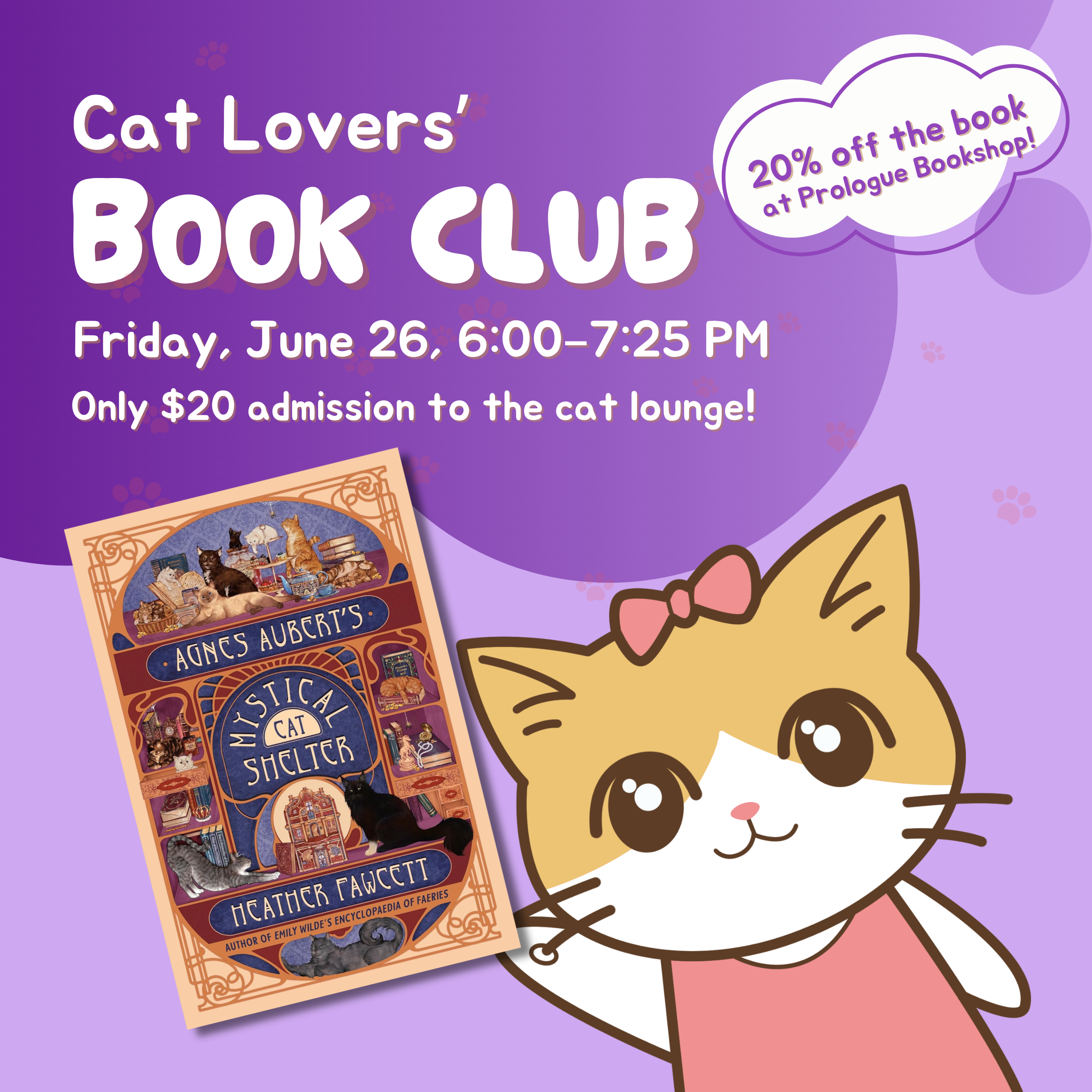 Cats, magic, romance—Agnes Aubert's Mystical Cat Shelter by Heather Fawcett has everything you need! In this heartwarming cozy fantasy, a woman running a cat rescue in 1920s Montréal turns to a grouchy-but-charming magician to save her shelter. Join us in the cat lounge for a relaxed chat about the book while we pet cute cats! Support local and get 20% off your copy at Prologue Bookshop with the code CATCAFE (in person or online)